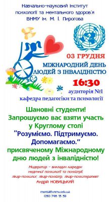 До Міжнародного дня людей з інвалідністю, який відзначається 3 грудня, Навчально-науковий інститут психології та ментального здоров’я ВНМУ ім. М. І. Пирогова організовує для студентів відкриту зустріч, присвячену темі підтримки, розуміння та взаємодопомоги.