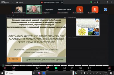 У вівторок інтерактивний тренінг для здобувачів освіти «Самодопомога для запобігання розвитку психічних розладів серед українських студентів» провела доцентка кафедри психіатрії, наркології та психотерапії Наталія Рациборинська-Полякова. Під час тренінгу студенти мали можливість опанувати навички самодопомоги для відновлення й збереження ментального здоров’я, які стануть в пригоді їм, їхнім друзям і майбутнім пацієнтам.